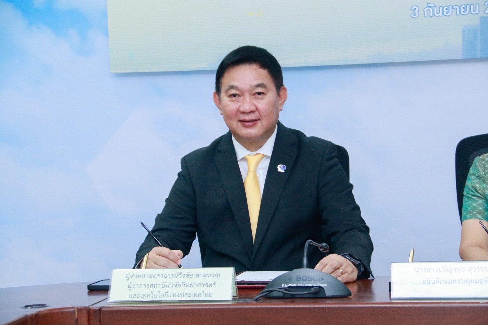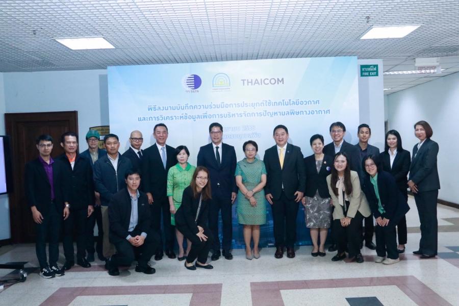 กระทรวงการอุดมศึกษา วิทยาศาสตร์ วิจัยและนวัตกรรม (อว.) โดย ผศ.ดร.วีรชัย อาจหาญ ผู้ว่าการ สถาบันวิจัยวิทยาศาสตร์และเทคโนโลยีแห่งประเทศไทย (วว.) นางสาวปรีญาพร สุวรรณเกษ อธิบดีกรมควบคุมมลพิษ กระทรวงทรัพยากรธรรมชาติและสิ่งแวดล้อม (ทส.) และนายปฐมภพ สุวรรณศิริ ประธานเจ้าหน้าที่บริหาร บริษัท ไทยคม จำกัด (มหาชน) หรือ THAICOM ร่วมลงนามบันทึกข้อตกลงความเข้าใจว่าด้วยความร่วมมือในการประยุกต์ใช้เทคโนโลยีอวกาศและการวิเคราะห์ข้อมูลเพื่อการบริหารจัดการปัญหามลพิษทางอาการ โดยมี ดร.พัชทรา มณีสินธุ์ รองผู้ว่าการวิจัยและพัฒนาด้านพัฒนาอย่างยั่งยืน วว. และ นายปิยะวัฒน์ จริยเศรษฐพงศ์ หัวหน้าคณะผู้บริหารด้านการค้า THAICOM และนายวรวรรฒน์ วิไลวงษ์ ผู้จัดการแผนกสัญญา กรมควบคุมมลพิษ ร่วมเป็นสักขีพยาน
