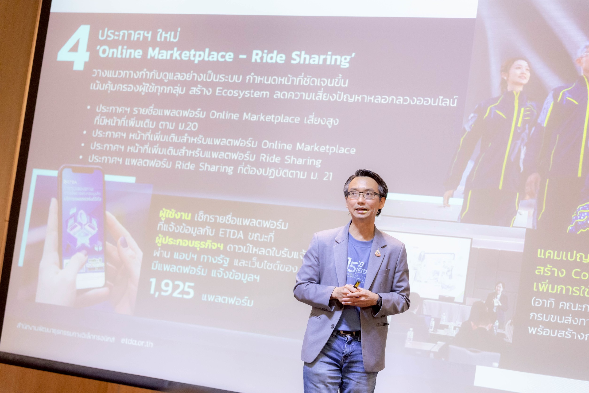 พร้อมกันนี้ ETDA ยังเดินหน้าอย่างต่อเนื่องเพื่อยกระดับการทำธุรกรรมออนไลน์ผ่านบริการแพลตฟอร์มดิจิทัลของคนไทยให้ปลอดภัย น่าเชื่อถือ ด้วยการเร่งเครื่องกลไกร่วมกำกับ ร่วมกับหน่วยงานกำกับดูแลอื่น ๆ ที่เกี่ยวข้อง ตลอดจนหน่วยงานภาครัฐ เอกชน และผู้ให้บริการแพลตฟอร์มดิจิทัล ภายใต้ประกาศฯ และข้อเสนอแนะต่างๆ ที่พร้อมใช้งานแล้ว อาทิ คู่มือการพิสูจน์และยืนยันตัวตนเพื่อลงทะเบียนผู้ใช้บริการบนแพลตฟอร์มดิจิทัล คู่มือการดูแลโฆษณาออนไลน์บนแพลตฟอร์มดิจิทัล คู่มือการดูแลเกี่ยวกับการขายสินค้าที่ต้องมีมาตรฐานของสินค้าบนบริการแพลตฟอร์มดิจิทัล และ ขมธอ. 32-2565 ว่าด้วยการรวบรวม กลั่นกรอง และเผยแพร่รีวิว ของผู้บริโภคบนช่องทางออนไลน์ รวมไปถึง ประกาศฉบับใหม่ที่ครอบคลุมทั้งแพลตฟอร์มประเภท Online Marketplace และ Ride Sharing เพื่อกำหนดหน้าที่เพิ่มเติมให้กับแพลตฟอร์มที่เข้าข่ายให้มีทิศทางการกำกับดูแลบริการของตนเอง (Self-Regulation) อย่างเป็นระบบ รวมถึงเดินหน้าแคมเปญ “DPS Trust Every Click” เปิดพื้นที่แลกเปลี่ยนมุมมองจากทุกภาคส่วน เพื่อสร้างการรับรู้และร่วมพัฒนากลไกความร่วมมือในการผลักดันให้เกิดระบบนิเวศดิจิทัลที่ปลอดภัย พร้อมขยายผลการใช้ประกาศฯ และคู่มือต่างๆ ภายใต้กฎหมาย DPS เพิ่มมากขึ้น เพื่อยกระดับกลไกการกำกับดูแลบริการแพลตฟอร์มที่ทุกคนมีส่วนร่วม ควบคู่กับการ ‘สร้างภูมิคนไทยรู้ทันปัญหาออนไลน์’ ให้กับประชาชนทุกกลุ่มทั่วประเทศ ผ่านกิจกรรมการลงพื้นที่ร่วมกับพาร์ทเนอร์ ตลอดจนสื่อประชาสัมพันธ์ในรูปแบบต่างๆ ที่ทุกคนเข้าถึงได้