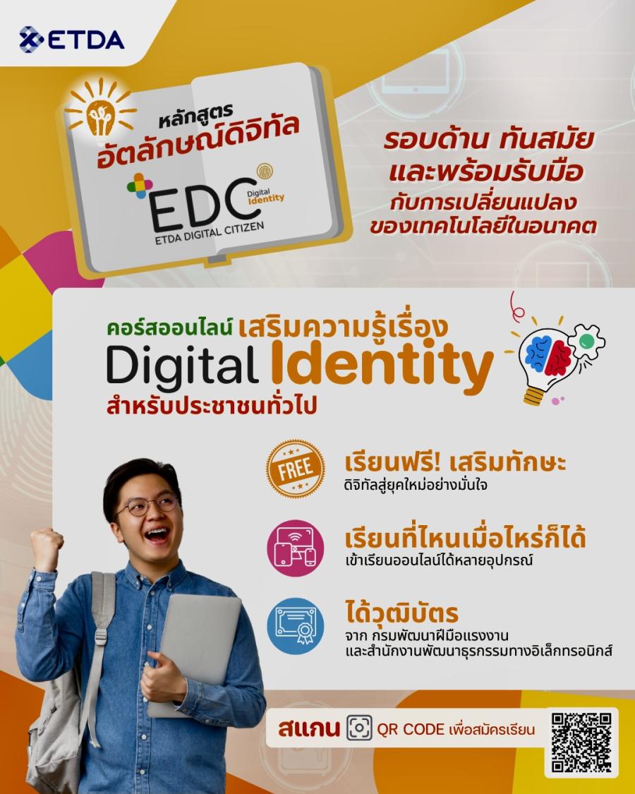 สำนักงานพัฒนาธุรกรรมทางอิเล็กทรอนิกส์ หรือ ETDA (เอ็ตด้า) เดินหน้าพัฒนาหลักสูตรภายใต้โครงการ ETDA Digital Citizen (EDC) เพื่อเสริมสร้างกำลังคนและพัฒนาทักษะด้านดิจิทัลให้เท่าทันต่อการเปลี่ยนแปลง โดยล่าสุดได้เปิดตัว“หลักสูตรอัตลักษณ์ดิจิทัล (Digital Identity) สำหรับประชาชน” หนึ่งในโมดูลสำคัญของหลักสูตร EDC Plus ซึ่งเป็นหลักสูตรเชิงลึกเฉพาะด้าน ที่มุ่งสร้างความรู้ความเข้าใจเกี่ยวกับอัตลักษณ์ดิจิทัล ทั้งในมิติการใช้งาน และการปกป้องให้ปลอดภัย และเกิดประโยชน์สูงสุด หลักสูตรนี้เกิดจากความร่วมมือกับศูนย์ชัวร์ก่อนแชร์ บริษัท อสมท จำกัด (มหาชน) และผู้เชี่ยวชาญจากหลากหลายหน่วยงานทั้งภาครัฐ ภาคการศึกษา และเอกชน สามารถเรียนฟรี พร้อมรับใบเซอร์ได้แล้ววันนี้ที่http://www.etda.or.th/th/edcdigitalidentity.aspx