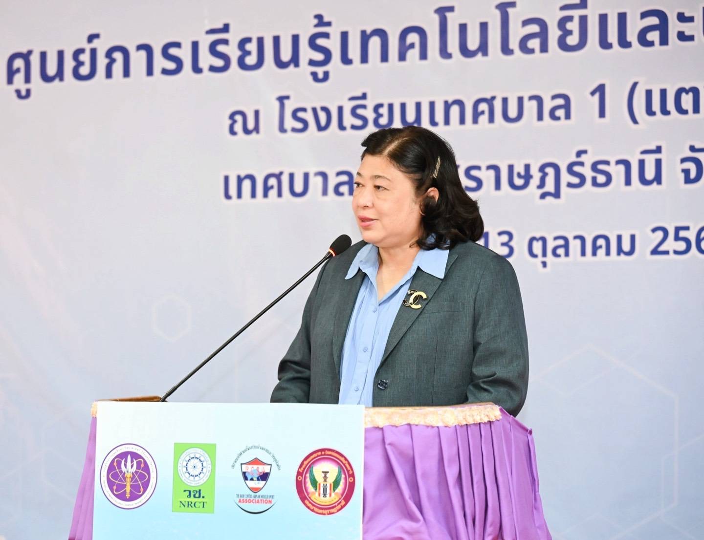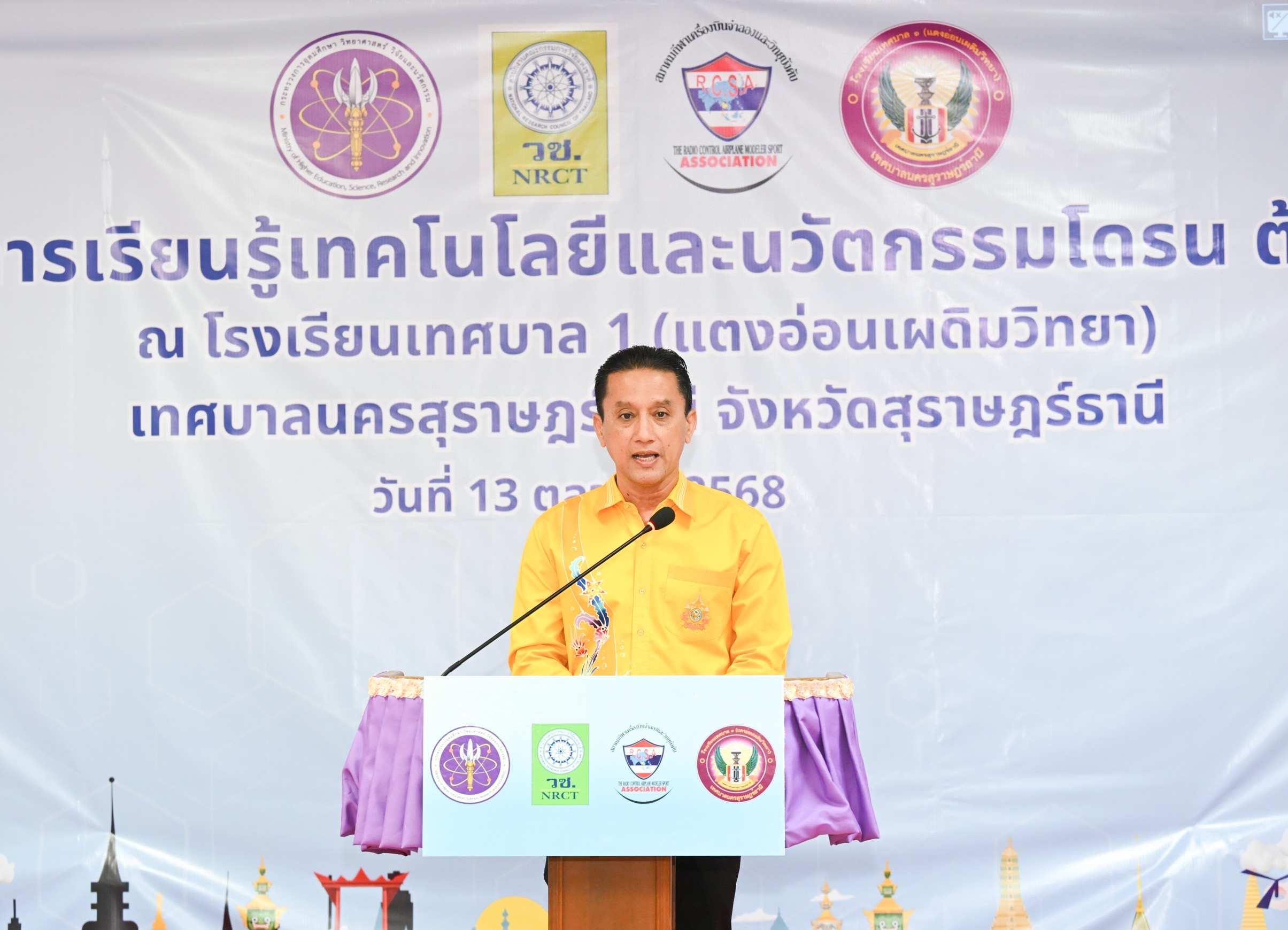 วันที่ 13 ตุลาคม 2568 สำนักงานการวิจัยแห่งชาติ (วช.) กระทรวงการอุดมศึกษา วิทยาศาสตร์ วิจัยและนวัตกรรม โดย ดร.วิภารัตน์ ดีอ่อง ผู้อำนวยการสำนักงานการวิจัยแห่งชาติ เป็นประธานในพิธีเปิด ”ศูนย์การเรียนรู้เทคโนโลยีและนวัตกรรมโดรน ต้นแบบภาคใต้” ในการนี้ได้รับเกียรติจาก นายทัศนัย เรืองนุ้ย รองนายกเทศมนตรีนครสุราษฎร์ธานี นายนิวัฒน์ กู้เขียว ผู้อำนวยการโรงเรียนเทศบาล 1 สุราษฎร์ธานี (แตงอ่อนเผดิมวิทยา) คณะผู้ทรงคุณวุฒิจาก วช. และ อาจารย์พิศิษฐ์ มิตรเกื้อกูล นายกสมาคมกีฬาเครื่องบินจำลองและวิทยุบังคับ พร้อมด้วยผู้บริหารสถานศึกษาในพื้นที่ ให้การต้อนรับ ณ โรงเรียนเทศบาล 1 สุราษฎร์ธานี (แตงอ่อนเผดิมวิทยา) จังหวัดสุราษฎร์ธานี