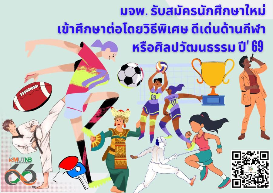 มหาวิทยาลัยเทคโนโลยีพระจอมเกล้าพระนครเหนือ (มจพ.) ประกาศรับสมัครนักศึกษาเข้าศึกษาใหม่ โครงการรับนักศึกษาโดยวิธีพิเศษ สำหรับผู้มีความสามารถดีเด่นด้านกีฬาหรือศิลปวัฒนธรรม ประจำปีการศึกษา 2569 เปิดรับสมัครระหว่างวันที่ 10 ตุลาคม 2568 - วันที่ 20 มกราคม 2569 รายละเอียดดังนี้
