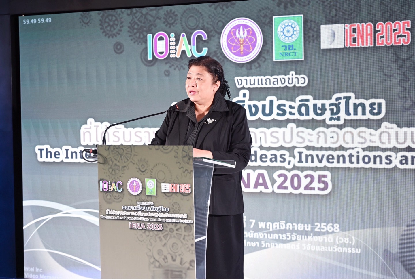 วันที่ 7 พฤศจิกายน 2568 สำนักงานการวิจัยแห่งชาติ(วช.) กระทรวงการอุดมศึกษา วิทยาศาสตร์ วิจัยและนวัตกรรม จัดการแถลงข่าวผลงานสิ่งประดิษฐ์ไทยที่ได้รับรางวัลจากเวที “The International Trade Fair-Ideas Inventions and New Products” (iENA 2025) โดย ดร.วิภารัตน์ ดีอ่อง ผู้อำนวยการสำนักงานการวิจัยแห่งชาติ เป็นประธานในพิธี ณ ศูนย์ข้อมูลสารสนเทศกลางด้านวิทยาศาสตร์ วิจัยและนวัตกรรมของประเทศ สำนักงานการวิจัยแห่งชาติ