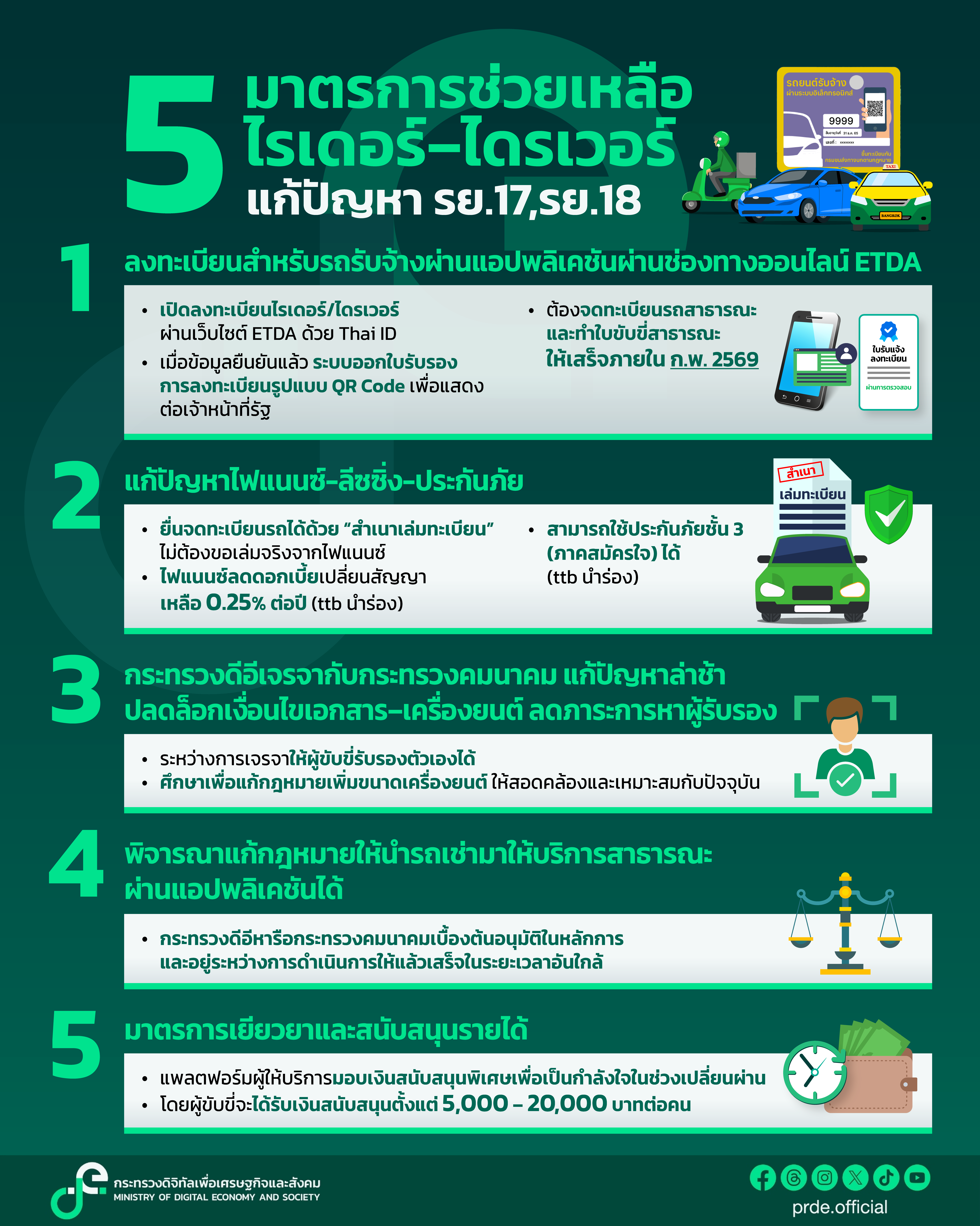 สำหรับ 5 มาตรการช่วยเหลือเร่งด่วนเพื่อลดภาระและอำนวยความสะดวกให้แก่ไรเดอร์และไดรเวอร์ทั่วประเทศ มีรายละเอียดดังนี้