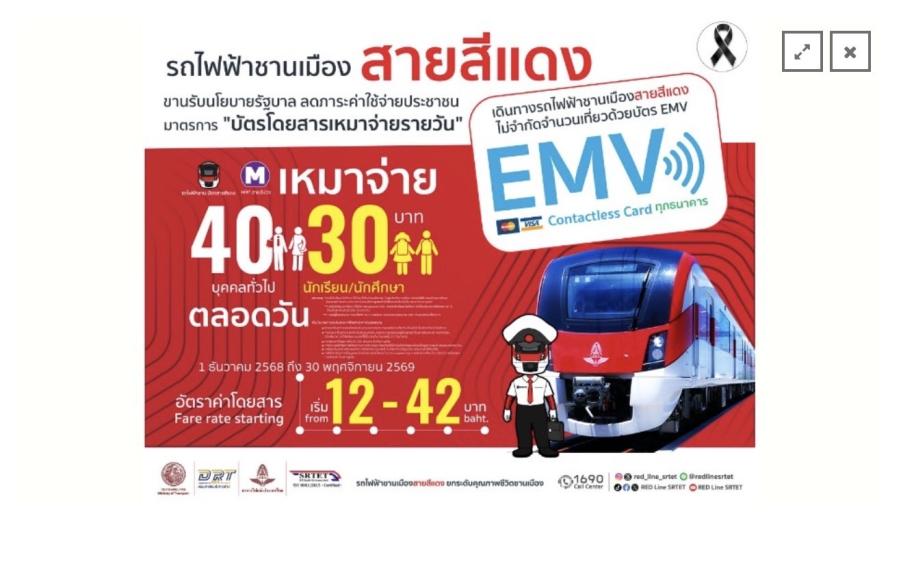 บริษัท รถไฟฟ้า ร.ฟ.ท. จำกัด ผู้ให้บริการรถไฟฟ้าชานเมืองสายสีแดง ดำเนินมาตรการ “บัตรโดยสารเหมาจ่ายรายวัน” สูงสุด ไม่เกิน 40 บาท ลดภาระค่าใช้จ่ายประชาชน ตามนโยบายรัฐบาล เริ่ม 1 ธ.ค. 68
