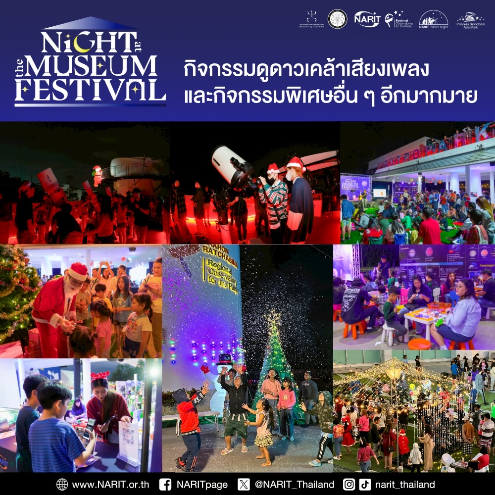 สถาบันวิจัยดาราศาสตร์แห่งชาติ (องค์การมหาชน) (สดร. หรือ NARIT) กระทรวงการอุดมศึกษา วิทยาศาสตร์ วิจัยและนวัตกรรม (อว.) ชวนเที่ยวนิทรรศการดาราศาสตร์ ท้องฟ้าจำลองรอบพิเศษยามค่ำคืน พร้อมกิจกรรมมากมายส่งท้ายเทศกาลคริสต์มาส และเพลิดเพลินกับการชมดาวเคล้าเสียงเพลง ใน “NARIT Night at the Museum 2025” วันที่ 27 - 28 ธันวาคม 2568 เวลา 10:00 - 22:00 น. ณ อุทยานดาราศาสตร์สิรินธร อ. แม่ริม จ. เชียงใหม่ และหอดูดาวภูมิภาคสำหรับประชาชนทั้ง 4 แห่ง ที่นครราชสีมา ขอนแก่น ฉะเชิงเทรา และสงขลา