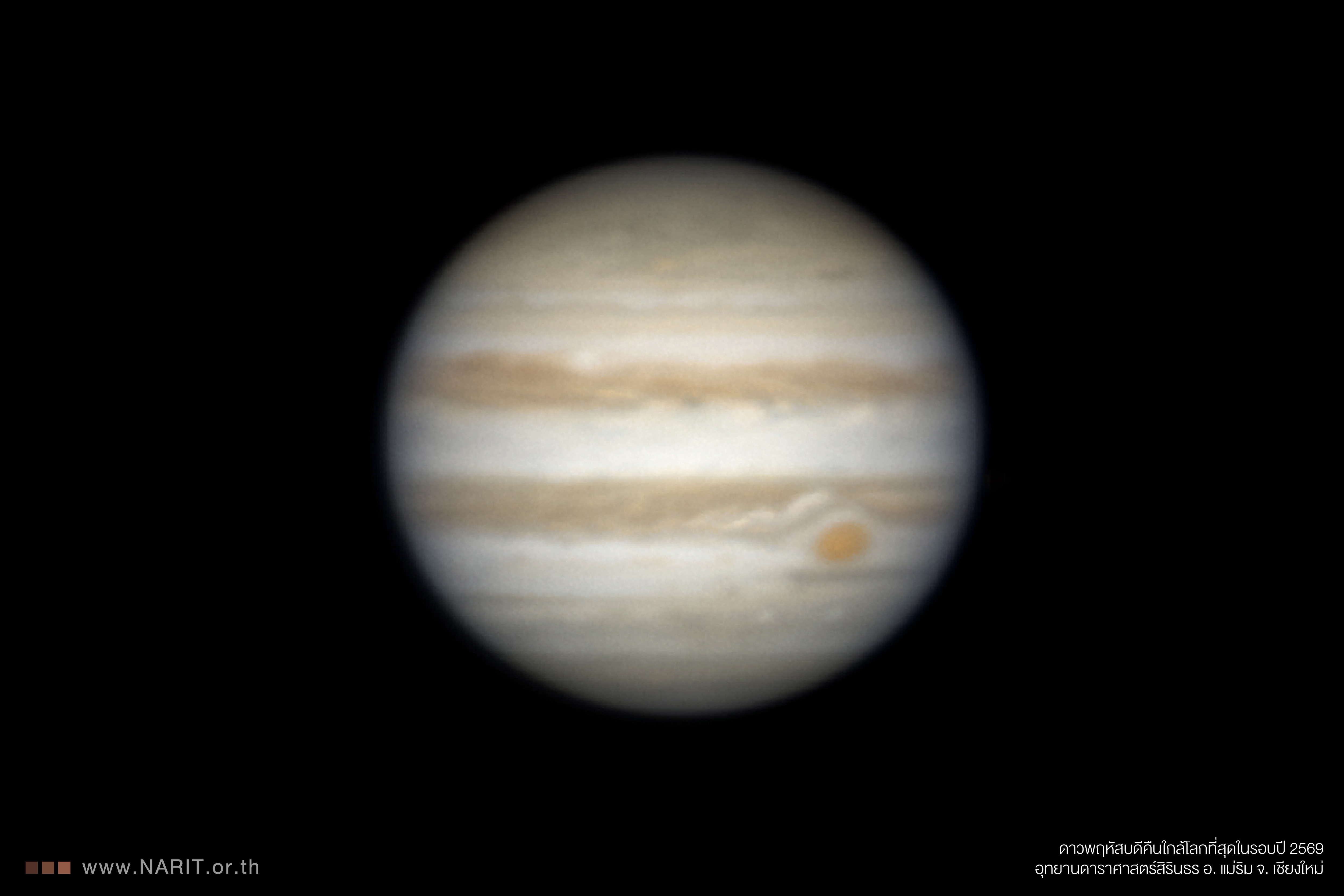 สถาบันวิจัยดาราศาสตร์แห่งชาติ (องค์การมหาชน) (สดร. หรือ NARIT) กระทรวงการอุดมศึกษา วิทยาศาสตร์ วิจัย และนวัตกรรม (อว.) เผยภาพดาวพฤหัสบดีใกล้โลกที่สุดในรอบปี คืนวันเด็กแห่งชาติ 10 มกราคม 2569 บันทึกผ่านกล้องโทรทรรศน์ขนาด 0.7 เมตร ณ อุทยานดาราศาสตร์สิรินธร จ. เชียงใหม่ ในภาพปรากฏจุดแดงใหญ่ทางขวา รวมถึงแถบเมฆ และพายุบนดาวพฤหัสบดีอย่างชัดเจน