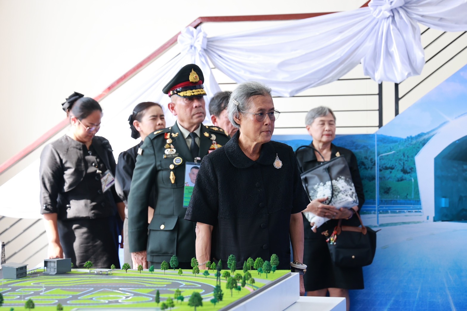 จากนั้น สมเด็จพระกนิษฐาธิราชเจ้า กรมสมเด็จพระเทพรัตนราชสุดาฯ สยามบรมราชกุมารี เสด็จพระราชดำเนินไปยังจุดแสดงนิทรรศการ ทรงทอดพระเนตรนิทรรศการภาพรวมของกรมวิทยาศาสตร์บริการ โดย ดร.พจมาน ท่าจีน รองอธิบดี รักษาราชการแทนอธิบดีกรมวิทยาศาสตร์บริการ ได้กราบบังคมทูลถวายรายงานผลการดำเนินงานโครงการฯ ซึ่งมีเป้าหมายเพื่อจัดตั้งสนามทดสอบยานยนต์อัตโนมัติที่เป็นโครงสร้างพื้นฐานสำคัญด้านคุณภาพ (National Quality Infrastructure: NQI) รองรับการพัฒนา การทดสอบ และการประเมินความปลอดภัยของยานยนต์แห่งอนาคต เพื่อยกระดับอุตสาหกรรมยานยนต์ของประเทศให้เป็นที่ยอมรับในระดับสากล พร้อมด้วยนิทรรศการของหน่วยงานร่วม ได้แก่ การทางพิเศษแห่งประเทศไทย จุฬาลงกรณ์มหาวิทยาลัย มหาวิทยาลัยเทคโนโลยีพระจอมเกล้าธนบุรี สำนักงานพัฒนาวิทยาศาสตร์และเทคโนโลยีแห่งชาติ หลังจากเสด็จออกจากบริเวณจัดนิทรรศ สมเด็จพระกนิษฐาธิราชเจ้า กรมสมเด็จพระเทพรัตนราชสุดาฯ สยามบรมราชกุมารี ทรงทอดพระเนตรการเพื่อการสาธิตสมรรถนะยานยนต์ขับขี่อัตโนมัติ และระบบระบุตำแหน่งด้วยเลเซอร์ ก่อนเสด็จไปยังพลับพลาพิธี เพื่อทรงฉายพระฉายาลักษณ์ร่วมกับผู้บริหารกระทรวง อว. ผู้บริหารและเจ้าหน้าที่กรมวิทยาศาสตร์บริการ พร้อมทรงลงพระนามาภิไธยในแผ่นศิลา และเสด็จออกจากพลับพลาพิธี ประทับรถยนต์พระที่นั่งเพื่อเสด็จไปยังเรือนรับรองที่ประทับวิทยพิมาน อำเภอวังจันทร์ จังหวัดระยอง