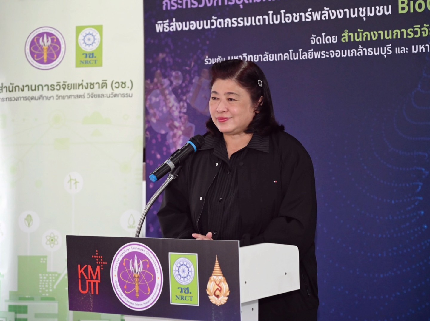ดร.วิภารัตน์ ดีอ่อง ผู้อำนวยการสำนักงานการวิจัยแห่งชาติ กล่าวว่า อว.ได้จัดทำโครงการของขวัญปีใหม่ 2569 ซึ่ง วช.ได้ร่วมมอบนวัตกรรมเพื่อการใช้ประโยชน์ให้กับพื้นที่ ผ่านนวัตกรรมเตาไบโอชาร์พลังงานชุมชน BioCycle Kiln โดยสนับสนุนให้มหาวิทยาลัยเทคโนโลยีพระจอมเกล้าธนบุรีร่วมกับมหาวิทยาลัยแม่ฟ้าหลวง ร่วมพัฒนานวัตกรรมดังกล่าว ควบคู่ไปกับการถ่ายทอดองค์ความรู้ด้านการใช้งานสู่ชุมชน เพื่อให้สามารถนำเทคโนโลยีไปประยุกต์ใช้ในการจัดการเศษวัสดุเหลือทิ้ง ทางการเกษตรได้อย่างมีประสิทธิภาพ ลดปัญหามลพิษ PM2.5 พร้อมส่งเสริมให้ชุมชนสามารถพึ่งพาตนเองด้านเทคโนโลยี ต่อยอดการใช้ประโยชน์เชิงเศรษฐกิจและสิ่งแวดล้อม อันจะนำไปสู่การพัฒนาคุณภาพชีวิตของประชาชนและความเข้มแข็งของชุมชน