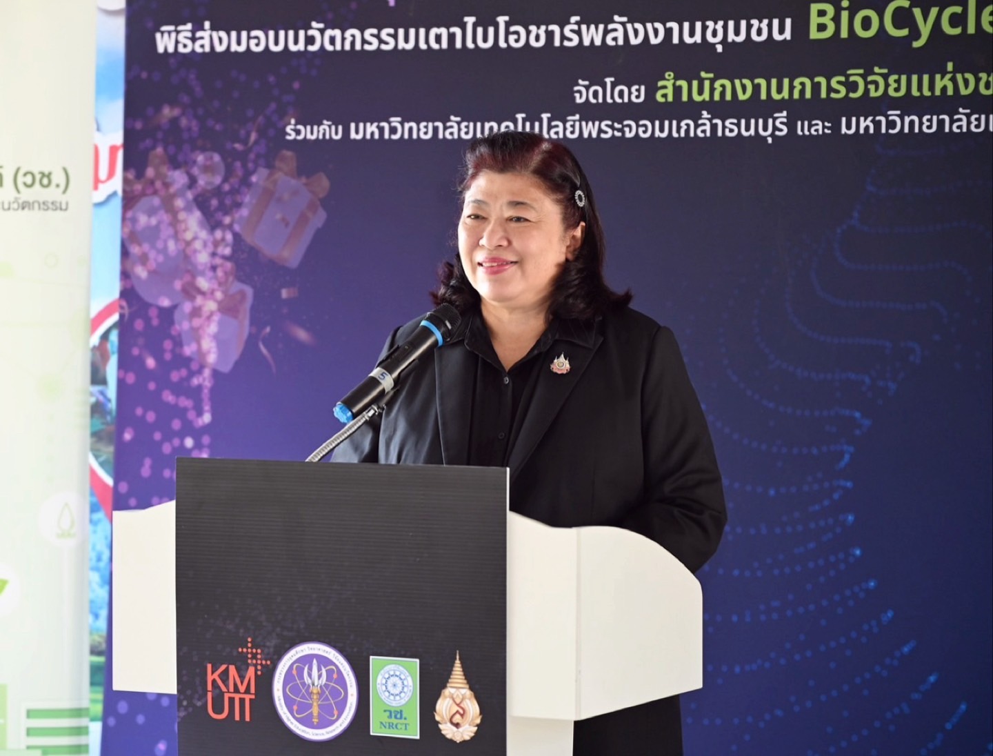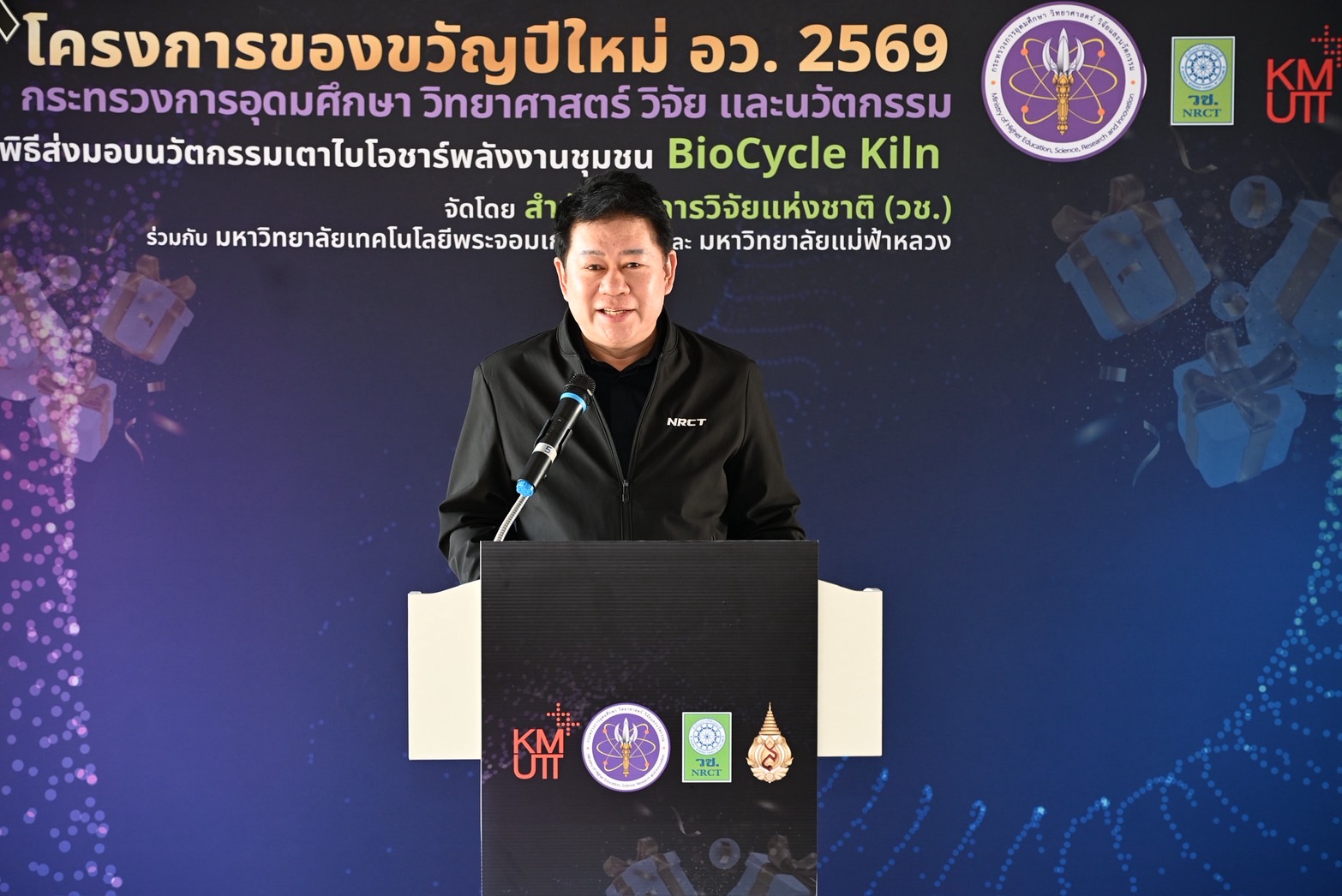 ดร.วิภารัตน์ ดีอ่อง ผู้อำนวยการสำนักงานการวิจัยแห่งชาติ กล่าวว่า กล่าวว่า โครงการของขวัญปีใหม่ อว. 2569 เป็นกลไกสำคัญในการนำนวัตกรรมไปใช้ประโยชน์ในระดับพื้นที่ โดย วช. ได้ร่วมขับเคลื่อนการถ่ายทอดเทคโนโลยี เตาไบโอชาร์พลังงานชุมชน BioCycle Kiln ซึ่งพัฒนาจากความร่วมมือระหว่างมหาวิทยาลัยเทคโนโลยีพระจอมเกล้าธนบุรี และมหาวิทยาลัยแม่ฟ้าหลวง พร้อมทั้งเสริมสร้างองค์ความรู้ด้านการใช้งานให้แก่ชุมชนอย่างเป็นระบบ เพื่อให้สามารถนำไปประยุกต์ใช้ในการจัดการเศษวัสดุเหลือทิ้งทางการเกษตรได้อย่างมีประสิทธิภาพ ลดการเผาในที่โล่ง อันเป็นสาเหตุของฝุ่น PM2.5 และส่งเสริมการพึ่งพาตนเองด้านเทคโนโลยี ต่อยอดสู่การสร้างมูลค่าเพิ่มทางเศรษฐกิจและสิ่งแวดล้อม อันจะนำไปสู่การยกระดับคุณภาพชีวิตของประชาชน