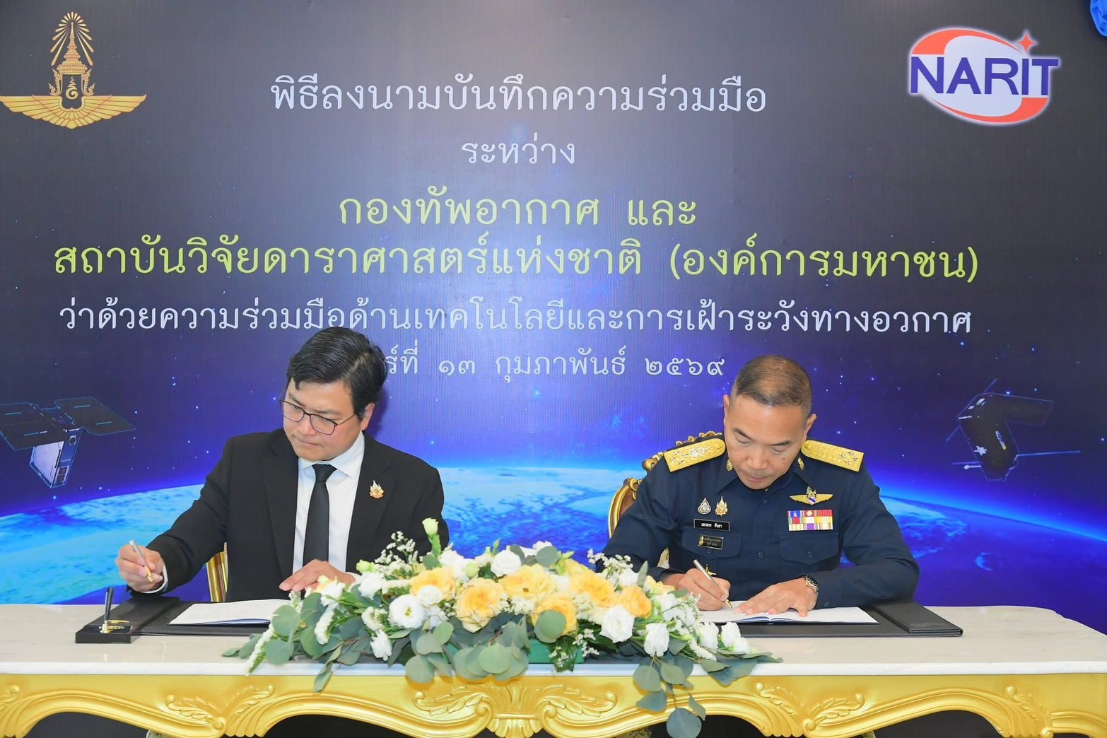 13 กุมภาพันธ์ 2569 - กรุงเทพฯ สถาบันวิจัยดาราศาสตร์แห่งชาติ (องค์การมหาชน) (สดร.) หรือ NARIT กระทรวงการอุดมศึกษา วิทยาศาสตร์ วิจัย และนวัตกรรม (อว.) โดย ดร. วิภู รุโจปการ ผู้อำนวยการสถาบันวิจัยดาราศาสตร์แห่งชาติ และกองทัพอากาศ (ทอ.) โดย พลอากาศเอก เสกสรร คันธา ผู้บัญชาการทหารอากาศ ลงนามบันทึกข้อตกลงความร่วมมือด้านเทคโนโลยีและการเฝ้าระวังทางอวกาศ เพื่อส่งเสริมศักยภาพด้านเทคโนโลยีและการเฝ้าระวังทางอวกาศ ยกระดับขีดความสามารถในการพัฒนาบุคลากรของประเทศ และสนับสนุนภารกิจด้านความมั่นคงทางอวกาศของชาติ พิธีลงนามจัดขึ้น ณ กองบัญชาการกองทัพอากาศ (บก.ทอ.) เขตดอนเมือง