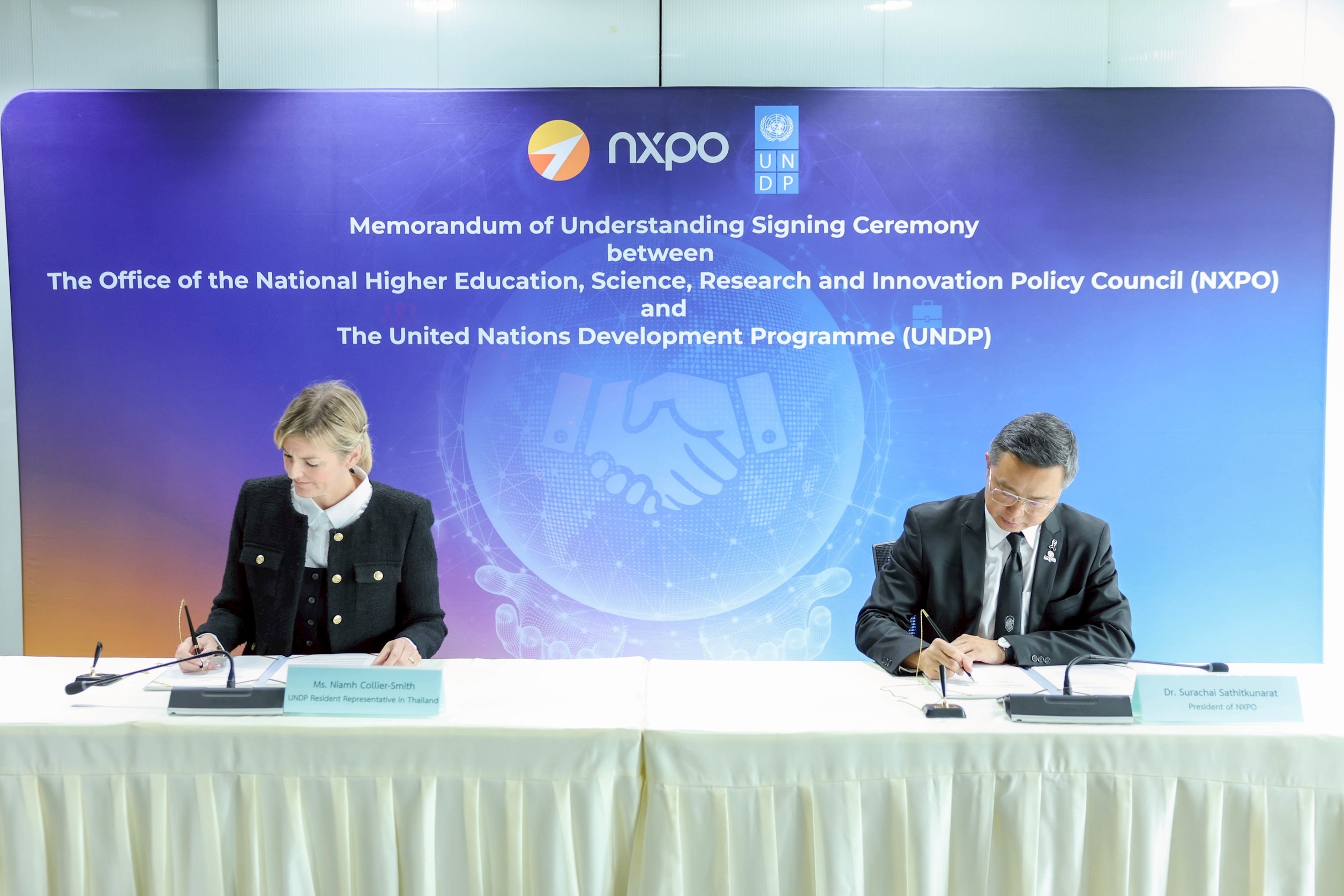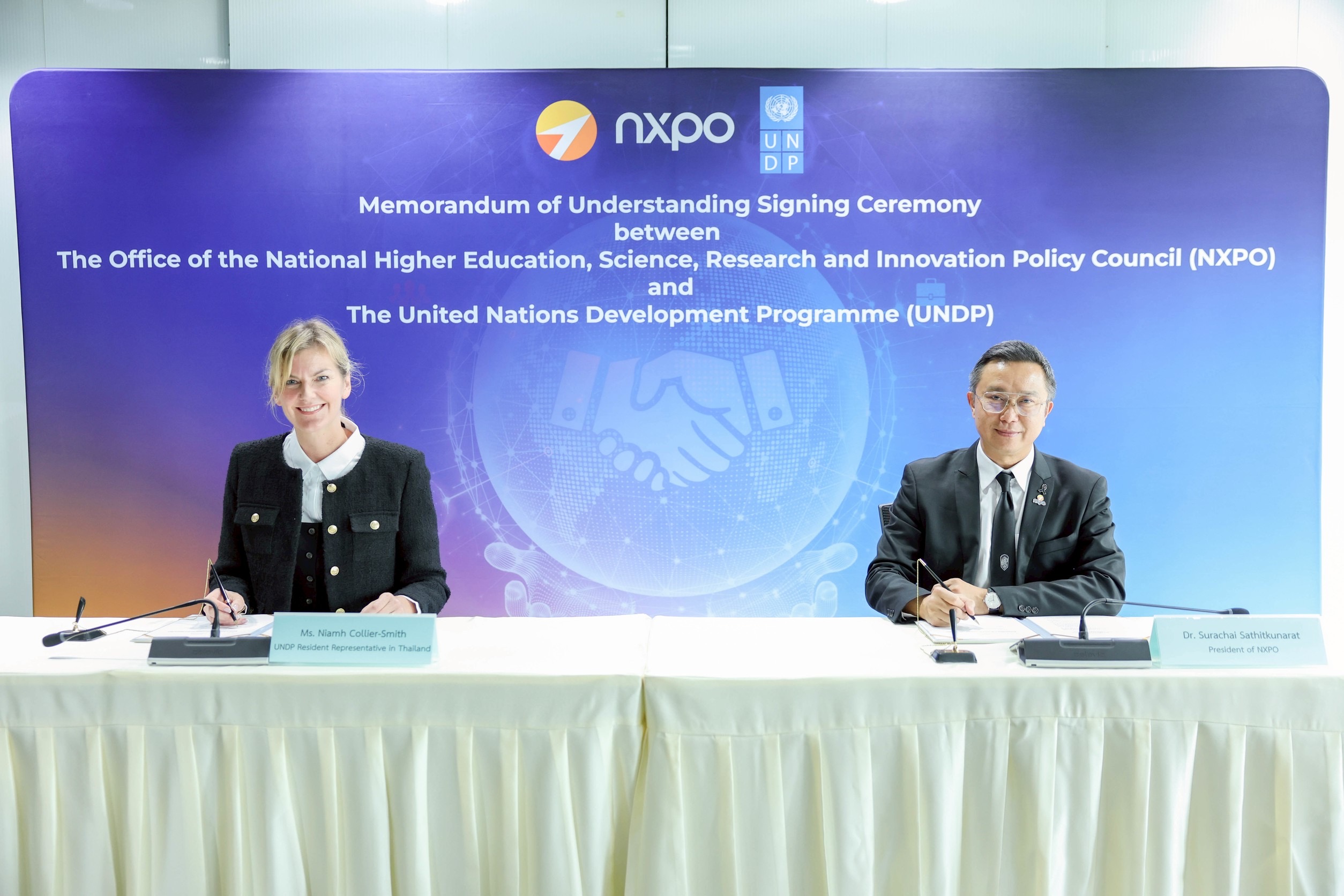 ด้าน Ms. Niamh Collier-Smith ผู้แทน UNDP ประจำประเทศไทย กล่าวว่า ความร่วมมือระหว่าง UNDP และ สอวช. จะเสริมสร้างการลงทุนของประเทศไทยในด้านวิทยาศาสตร์ เทคโนโลยีและนวัตกรรมนโยบาย เพื่อขับเคลื่อนเรื่องที่สำคัญของประเทศไทย มีการนำนวัตกรรมมาสร้างการทำงานที่มีผลเชิงบวกต่อผู้คนและโลก และยังมุ่งสนับสนุนให้ประชาชนสามารถก้าวทันการเปลี่ยนแปลงทางเทคโนโลยีและปัญญาประดิษฐ์ เพื่อให้มั่นใจว่าเทคโนโลยีช่วยลดช่องว่างในด้านความเหลื่อมล้ำได้