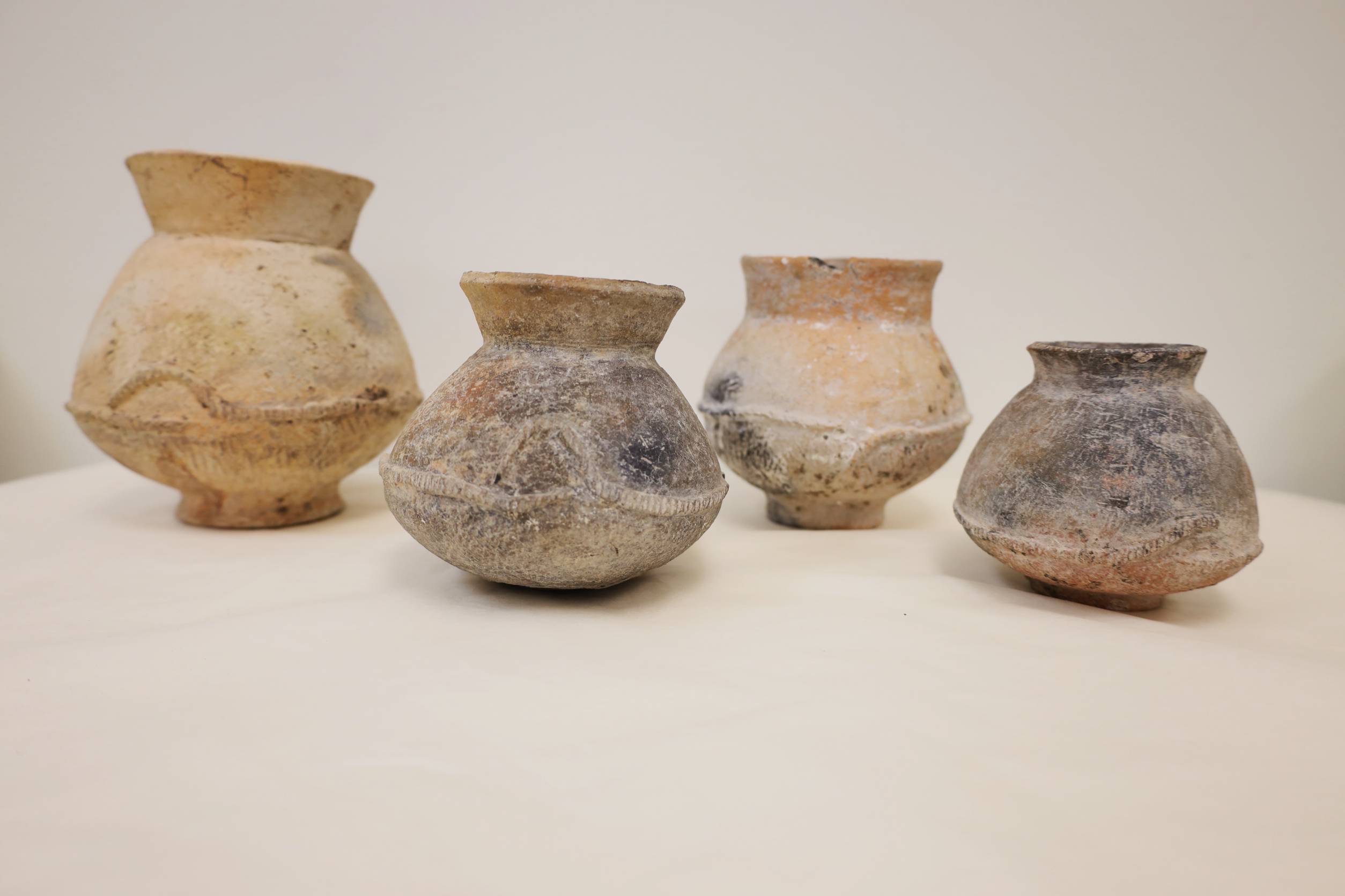 2. ภาชนะดินเผายุคก่อนประวัติศาสตร์ อายุ 1.800 – 2200 ปีมาแล้ว มีสภาพสมบูรณ์ ตกแต่งพื้นผิวให้ไม่ลื่นมือเมื่อหยิบจับ ด้วยการกดเส้นเชือกเป็นลายเชือกทาบและปั้นแปะดินปั้นเป็นเส้นเชือกประกอบกัน