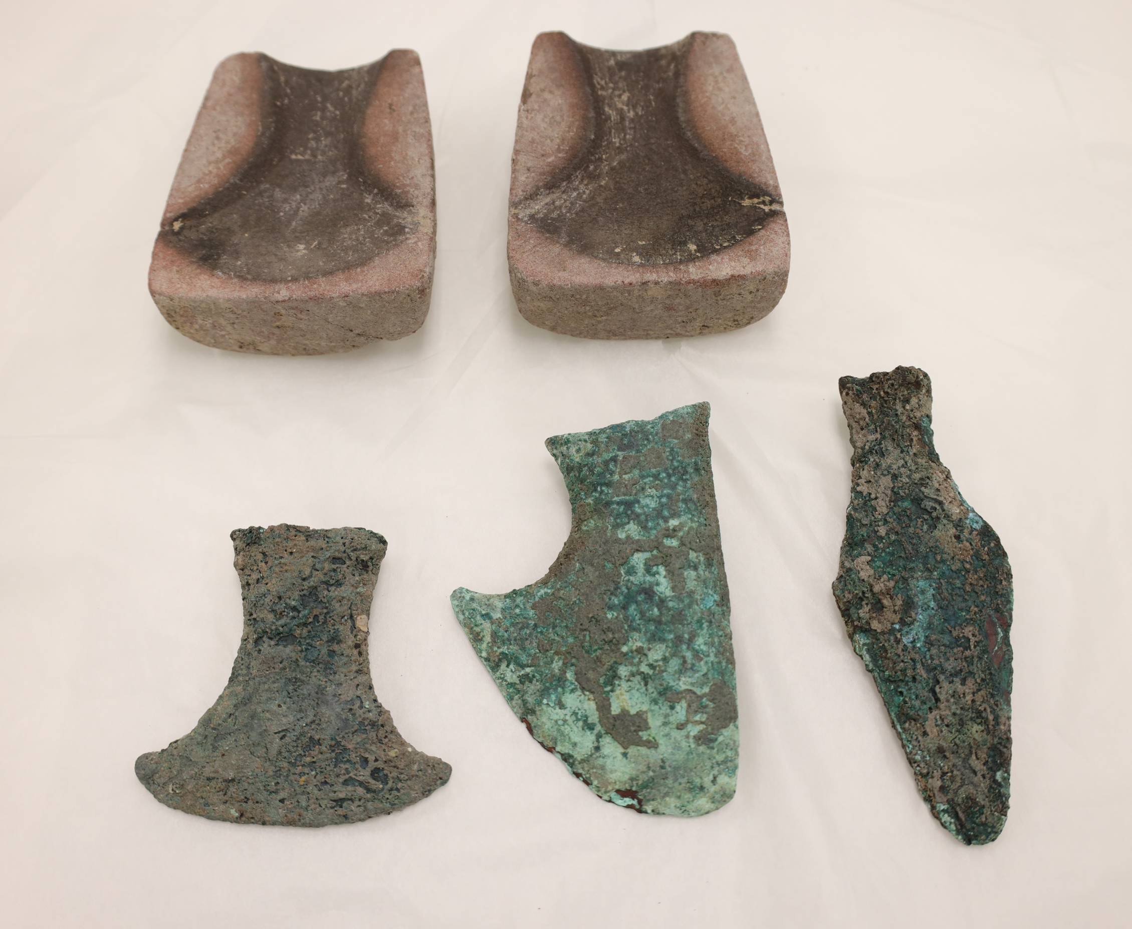 3. ใบขวานสำริดพร้อมแม่พิมพ์ ยุคก่อนประวัติศาสตร์ อายุ 1800 - 2200 ปีมาแล้ว แม่พิมพ์ ขวานนี้เป็นหลักฐานแสดงถึงความเชี่ยวชาญในการผสมโลหะ หล่อเครื่องมือเพื่อใช้ในชีวิตประจำวันของคนพื้นเมืองในยุคแรกเริ่มสังคมเกษตรกรรมในดินแดนไทย