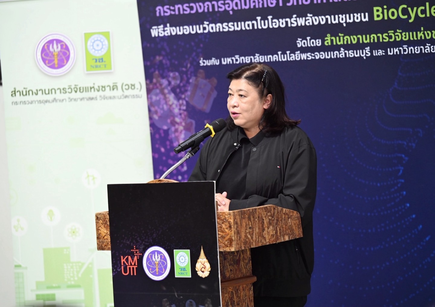 ดร.วิภารัตน์ ดีอ่อง ผู้อำนวยการสำนักงานการวิจัยแห่งชาติ กล่าวว่า วช. ได้สนับสนุนการพัฒนา “นวัตกรรมเตาไบโอชาร์พลังงานชุมชน BioCycle Kiln” ภายใต้แผนงานสำคัญตามยุทธศาสตร์ ววน. ในประเด็น “ประเทศไทยปลอดภัยจาก PM2.5” โดยมุ่งลดแหล่งกำเนิดฝุ่นควันตั้งแต่ต้นทาง นวัตกรรมดังกล่าวเป็นการนำเทคโนโลยีมาใช้ในการจัดการเศษวัสดุเหลือทิ้งทางการเกษตร แปรรูปเป็นไบโอชาร์เพื่อนำไปปรับปรุงและบำรุงดิน เพิ่มประสิทธิภาพการผลิต ควบคู่กับการสร้างมูลค่าเพิ่มทางเศรษฐกิจให้แก่เกษตรกรอย่างเป็นรูปธรรม