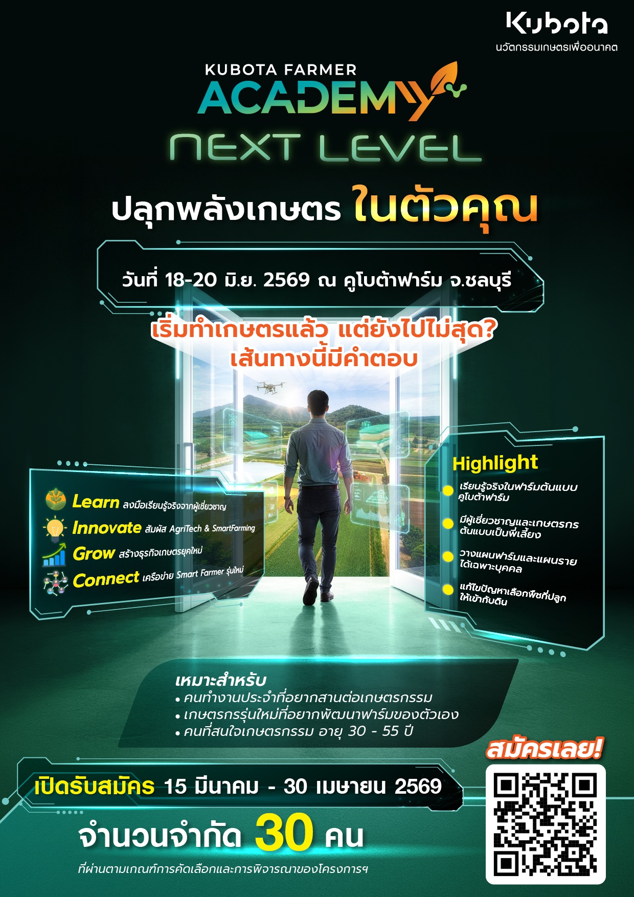 โดยโครงการ “KUBOTA Farmer Academy : Next Level” เปิดโอกาสให้คนทำงานประจำที่สนใจต่อยอดสู่อาชีพเกษตรกรรม เกษตรกรรุ่นใหม่ที่ต้องการพัฒนาฟาร์มของตนเอง ตลอดจนผู้ที่สนใจเทคโนโลยีการเกษตร ที่มีอายุระหว่าง 30 – 55 ปี สมัครเข้าร่วมโครงการผ่านการกรอกใบสมัครออนไลน์ผ่านเฟซบุ๊ก Siam Kubota โดยผู้ที่ผ่านการคัดเลือกตามเกณฑ์ของโครงการทั้งหมด 30 คน จะได้เข้าร่วมเรียนรู้หลักสูตรเข้มข้นจากผู้เชี่ยวชาญและเกษตรกรต้นแบบ ตลอดจนพัฒนาทักษะการวางแผนฟาร์ม การออกแบบโมเดลรายได้เฉพาะบุคคล และเทคนิคการเลือกพืชให้เหมาะสมกับพื้นที่ เพื่อยกระดับการทำเกษตรสู่การบริหารจัดการฟาร์มอย่างมืออาชีพ พร้อมสัมผัสนวัตกรรมเกษตรครบวงจรในพื้นที่ฟาร์มสร้างประสบการณ์เกษตรสมัยใหม่โดยไม่เสียค่าใช้จ่าย ระหว่างวันที่ 18 – 20 มิถุนายน 2569 ณ คูโบต้าฟาร์ม จังหวัดชลบุรี