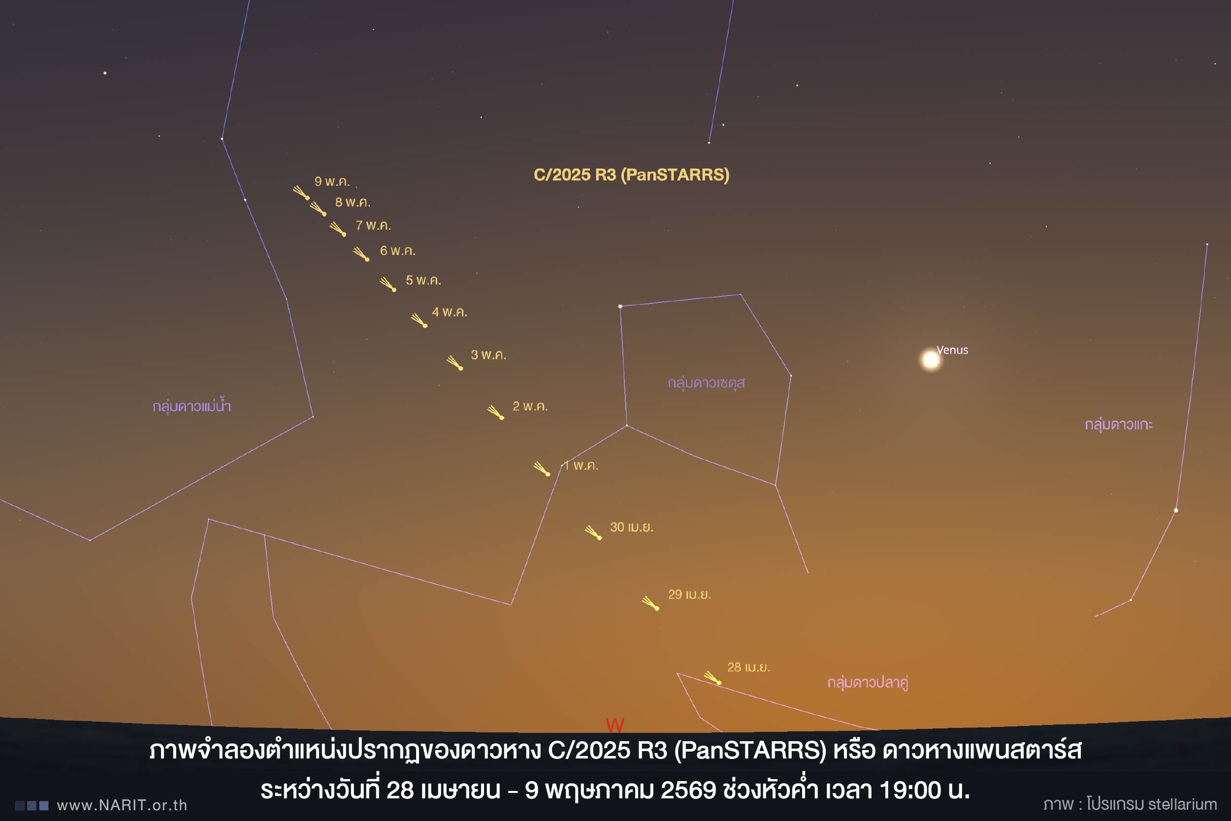นายศุภฤกษ์ คฤหานนท์ ผู้ช่วยผู้อำนวยการสถาบันวิจัยดาราศาสตร์แห่งชาติ กล่าวว่า ในช่วงเดือนเมษายน 2569 จะมีดาวหางที่น่าจับตา และอาจจะสว่างจนมองเห็นด้วยตาเปล่า จำนวน 2 ดวง ได้แก่ ดาวหางแม็ปส์ หรือ C/2026 A1 (MAPS) คาดว่าจะสว่างที่สุดต้นเดือนเมษายนนี้ และ ดาวหางแพนสตาร์ส หรือ C/2025 R3 (PanSTARRS) คาดว่าจะสว่างที่สุดช่วงหลังสงกรานต์