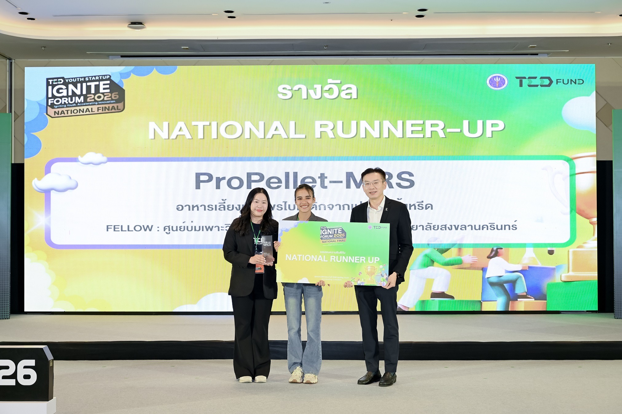 ขณะที่รางวัล “IGNITE Rising Star 2026” รองชนะเลิศอันดับ 1 ได้แก่ทีมPROPELLET – MRS อาหารเลี้ยงเชื้อโพรไบโอติกจากเปปโตนจิ้งหรีด จากศูนย์บ่มเพาะวิสาหกิจ อุทยานวิทยาศาสตร์ มหาวิทยาลัยสงขลานครินทร์