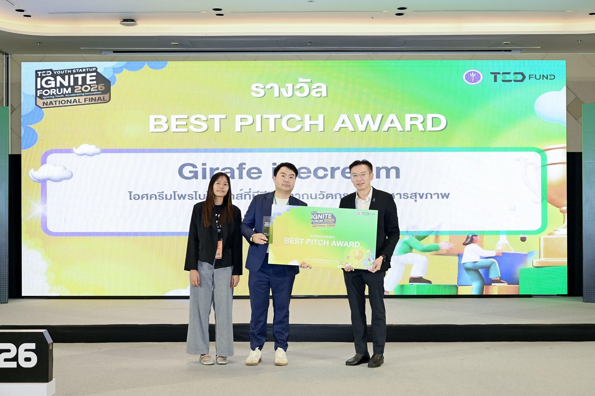 ส่วนรางวัล Best Pitch Award 2026 เป็นของทีม Girafe Icecream ไอศกรีมโพรไบโอติกส์ที่มีชีวิต โดย บริษัท เทสท์บัด จำกัด ที่นำเสนอผลงานได้อย่างน่าประทับใจ