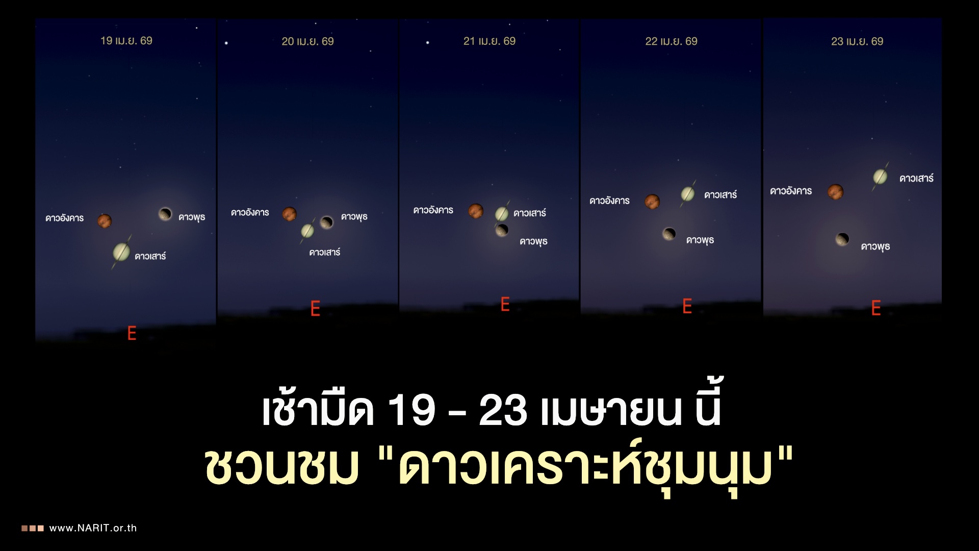 สถาบันวิจัยดาราศาสตร์แห่งชาติ (องค์การมหาชน) (สดร. หรือ NARIT) กระทรวงการอุดมศึกษา วิทยาศาสตร์ วิจัย และนวัตกรรม (อว.) ชวนชมปรากฏการณ์ “ดาวเคราะห์ชุมนุม”ระหว่างวันที่ 19 - 23 เมษายน 2569 ดาวอังคาร ดาวพุธ และดาวเสาร์ จะปรากฏใกล้กันบนฟ้าทางทิศตะวันออก ช่วงเช้ามืด หากฟ้าใส ไร้เมฆฝน ดูได้ด้วยตาเปล่าทั่วไทย