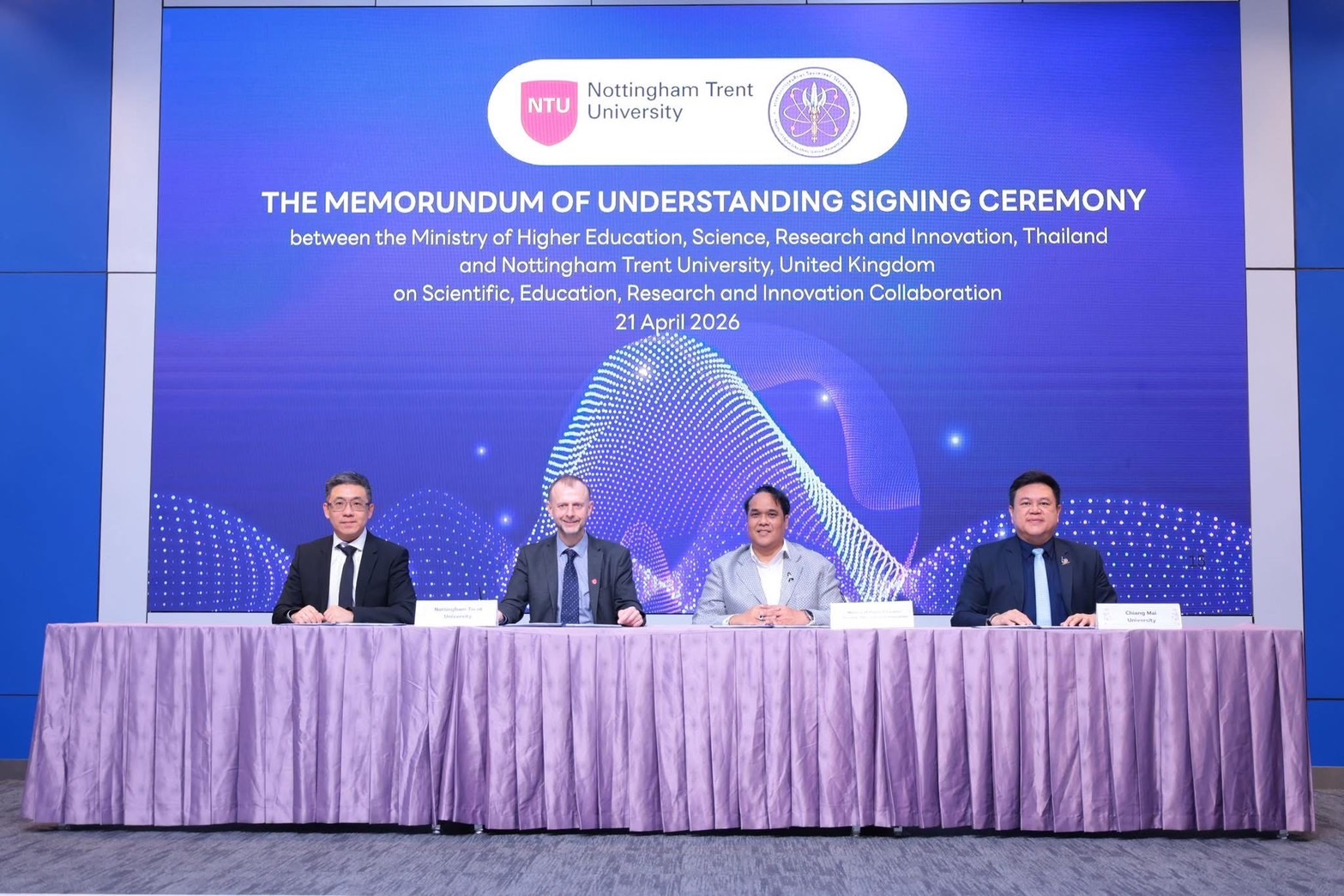 วันที่ 21 เม.ย. ดร.พันธุ์เพิ่มศักดิ์ อารุณี รองปลัดกระทรวงการอุดมศึกษา วิทยาศาสตร์ วิจัยและนวัตกรรม (อว.) เข้าร่วมพิธีลงนามบันทึกความเข้าใจความร่วมมือระหว่างกระทรวง อว. กับ มหาวิทยาลัยนอตติงแฮมเทรนต์ โดยมี ศ.เดวิด เพทลีย์ อธิการบดีและประธานมหาวิทยาลัย ศ.เซียว หม่า ผู้อำนวยการศูนย์การเปลี่ยนแปลงธุรกิจและอุตสาหกรรม พร้อมด้วย ผศ.ดร.ธัญญานุภาพ อานันทนะ รองอธิการบดี มหาวิทยาลัยเชียงใหม่ และ รศ.ดร.ปิติวัฒน์ วัฒนชัย ผู้อำนวยการอุทยานวิทยาศาสตร์และเทคโนโลยี มหาวิทยาลัยเชียงใหม่ เข้าร่วม ณ ห้องแถลงข่าวชั้น 1 อาคารพระจอมเกล้า สำนักงานปลัดกระทรวง อว.
