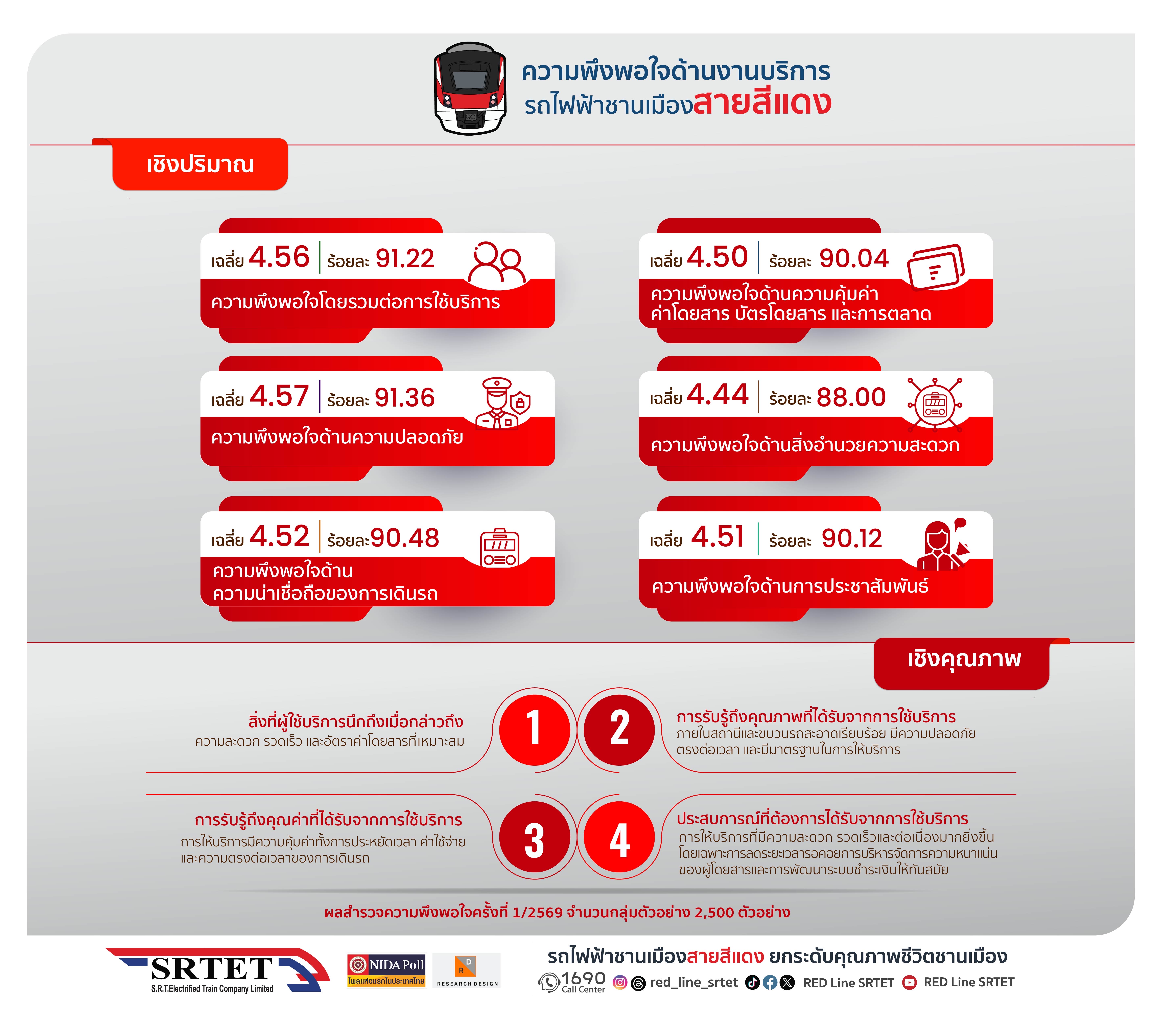 นายสุเทพ พันธุ์เพ็ง กรรมการผู้อำนวยการใหญ่ บริษัท รถไฟฟ้า ร.ฟ.ท. จำกัด (รฟฟท.) ผู้ให้บริการรถไฟฟ้าชานเมืองสายสีแดง เปิดเผยว่า บริษัทฯ ให้ความสำคัญอย่างยิ่งกับความคิดเห็นของผู้ใช้บริการ เนื่องจากเป็นข้อมูลสำคัญในการนำมาปรับปรุงพัฒนาการให้บริการ เพื่อตอบโจทย์ความต้องการของประชาชนให้ได้มากที่สุด โดยการสำรวจความพึงพอใจในครั้งนี้ นับเป็นการสำรวจครั้งที่ 1 ประจำปี 2569 มีการลงพื้นที่สำรวจทั้งในเชิงคุณภาพและเชิงปริมาณ ร่วมจัดทำขึ้นโดยสถาบันบัณฑิตพัฒนบริหารศาสตร์ (นิด้าโพล) ซึ่งเป็นสถาบันที่มีความความเชี่ยวชาญด้านงานวิจัยเชิงคุณภาพมาอย่างยาวนาน และบริษัท รีเสิร์ช ดีไซน์ ซึ่งเป็นหน่วยงานที่มีความเชี่ยวชาญด้านการออกแบบการสำรวจและงานวิจัยเช่นเดียวกัน โดยได้ทำการเก็บข้อมูลจากผู้ใช้บริการในทุกสถานี ผลปรากฏว่า ผู้ใช้บริการมีระดับความพึงพอใจในด้านต่างๆ จากคะแนนเต็ม 5 ดังนี้